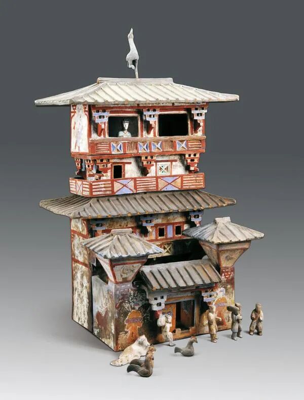 既能储粮又能居住,还有防御功能的住所,进一步诠释出古人心目中的五谷丰登、安居乐业。收藏于河南焦作市博物馆的汉代四层通体彩绘陶仓楼,系2009年出土于焦作白庄汉墓。其由院落、仓体、楼体组成,如“乐高”一样,各部分都可以拆卸组合。从下向上、从外向内看,一个农夫形象的陶俑背着重重的粮袋,正迈步走向院门口,其他3个陶俑则在院门右侧劳作,白色的看门犬、3只陶鸡闲适安逸,充满浓郁的生活气息。主楼一二层是一个整体粮仓,未设置门。再往上,窗前有一个坐俑、一个立俑,应是主人和侍者。庑殿式屋顶屋脊正中有一只单脚站立的朱雀,仰脖张嘴,向天长鸣。这一陶仓楼模型作为随葬器,展现了汉代庄园主的居住和生活场景。楼体彩绘主要使用朱红、白、紫、黑、黄(橘黄、土黄)、豆青6种颜色,朱红色的大量运用,体现了汉代对朱彩的崇尚。四层楼体背面绘有虎食女魃图:虎背饰虎皮纹,腹部为龙鳞花纹,肩生双翼,凸目怒睁,正俯首张口,欲吞噬仰倒的女子。据专家考证,女子为象征旱灾的女魃,该图像反映了汉代驱旱祈雨的观念。三层楼体背面绘有蛟龙出海图:紫色的龙身,黄褐色的龙首,肩部生翼,寓意风调雨顺。陶仓楼一二层仓体的背面,一棵朱红色的常青树寓意长寿,树上有6只青鸟——传说其为常伴仙人西王母的鸟,右侧是龙纹图案。作为我国目前已知唯一一座汉代通体彩绘陶仓楼,该模型具有重要的历史和艺术价值。