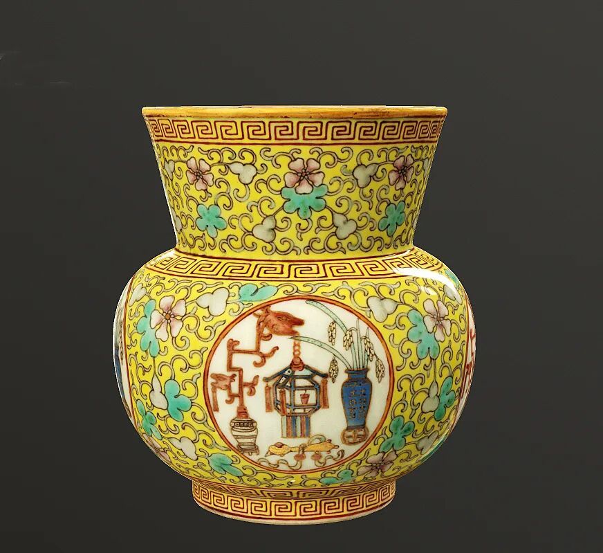 明清时期,五谷丰登纹饰被广泛用于官窑与民窑瓷器,成为农业立国思想的艺术化表达。其核心意象由稻、麦、黍、稷、豆五类谷物构成,辅以灯笼、蜜蜂等元素,寓意风调雨顺、仓廪充盈。北京故宫博物院收藏的清代粉彩葫芦万代五谷丰登纹渣斗,内绘粉彩缠枝葫芦纹,藤蔓相连,花果茂盛。据史料记载,此器为清同治年间专为皇帝大婚烧制的宫廷瓷器。葫芦,因谐音“福禄”,且果实累累,自古以来就被寄予福禄双全、子孙满堂的美好愿望。在清代,人们将五谷丰登纹与葫芦纹相结合,更添祥瑞。外壁黄地绘有相同葫芦纹,设四处圆形开光,内含宫灯、花瓶、如意、稻穗等,寓意平安如意、五谷丰登。开光内花瓶上饰以“囍”字,祈求子嗣繁衍、喜庆吉祥。整器设色鲜艳明丽,展现了清代晚期宫廷装饰的典型风格。渣斗又名奓斗、唾壶,起源于晋代,用于盛装唾吐物。如置于餐桌,盛载肉骨鱼刺等食物渣滓,小型者亦用于盛载茶渣,故也列于茶具之中。其造型源于青铜觚,形制多为喇叭口、高颈、鼓腹,瓷质最为常见,亦有银器、漆器、玻璃等材质。
