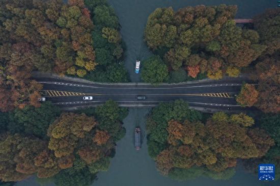 12月3日,汽车行驶在杭州西湖景区的杨公堤,游船从桥下穿过(无人机照片)。