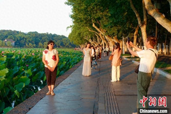 7月3日,游客在西湖边与朝霞合影。中新社记者 钱晨菲 摄