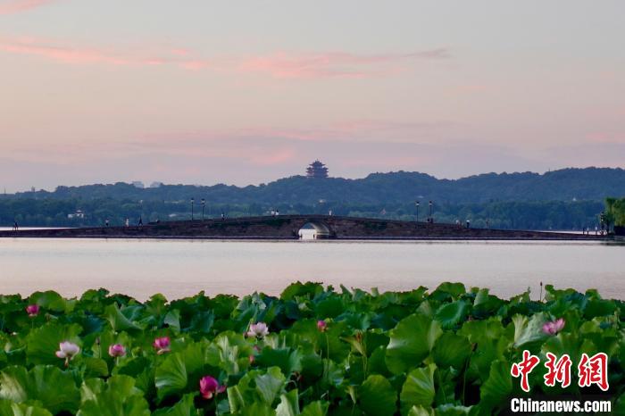 7月3日,朝霞下的西湖。盛夏时节,朝霞映照浙江杭州西湖,“映日荷花别样红”的景象吸引游人。中新社记者 钱晨菲 摄