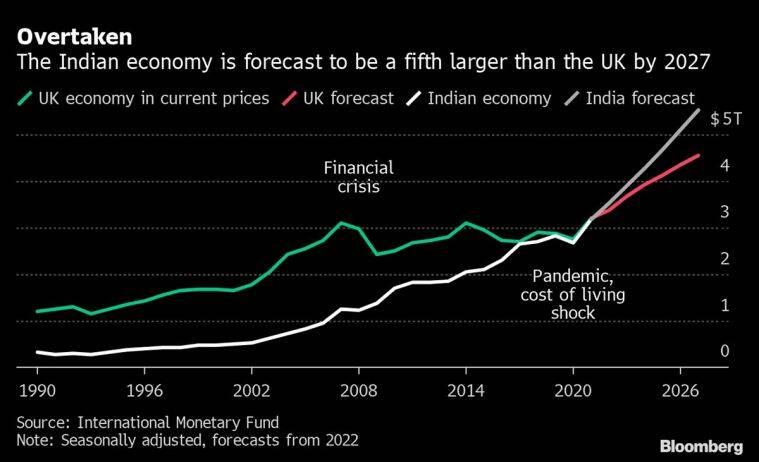 据彭博社综合国际货币基金组织(IMF)数据和彭博终端机上的历史汇率计算结果, 印度已经超过英国,成为世界第五大经济体。IMF预计,印度的经济规模将在2027年比英国大20%左右。
