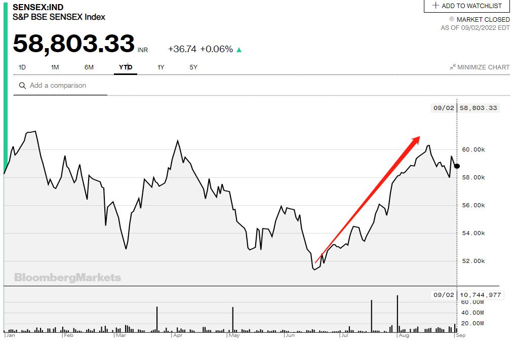 印度孟买SENSEX指数三季度以来录得强劲反弹(图片来源:彭博社)