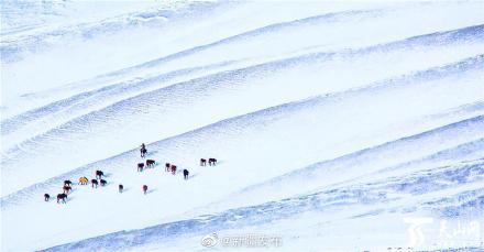 天山南北好风光 【骑马行走苍茫雪原】新疆是个好地方 2021年1月,一场降雪过后,新疆伊犁哈萨克自治州新源县南山草原披上了银装,蔚蓝的天空下,牧民赶着马羊在苍茫雪原上行走,在雪地上留下一条条美妙的线条。冬季,虽然新源县南山草原没有夏季的旖旎风光,但雪落广袤草原,一片清新淡雅,依然充满诗情画意,令人沉醉不已。