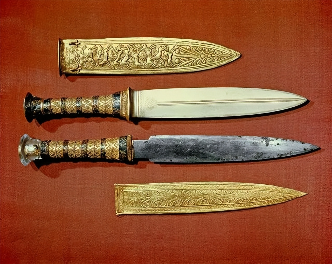 在拆解图坦卡蒙木乃伊时,考古学家发现了几把精美的匕首,其中一把刀刃由铁制成,刀柄为黄金材质,刀尖镶嵌水晶。