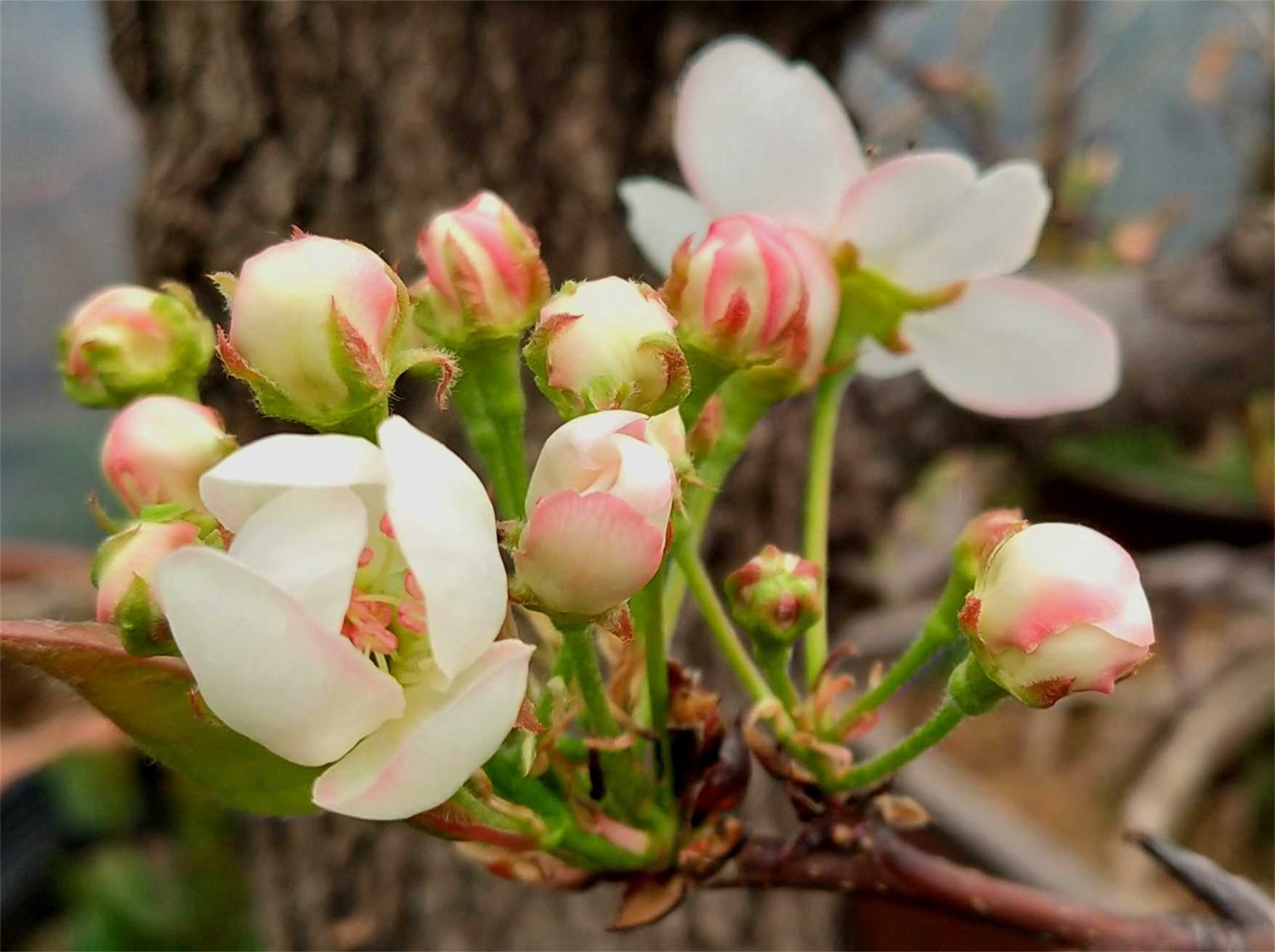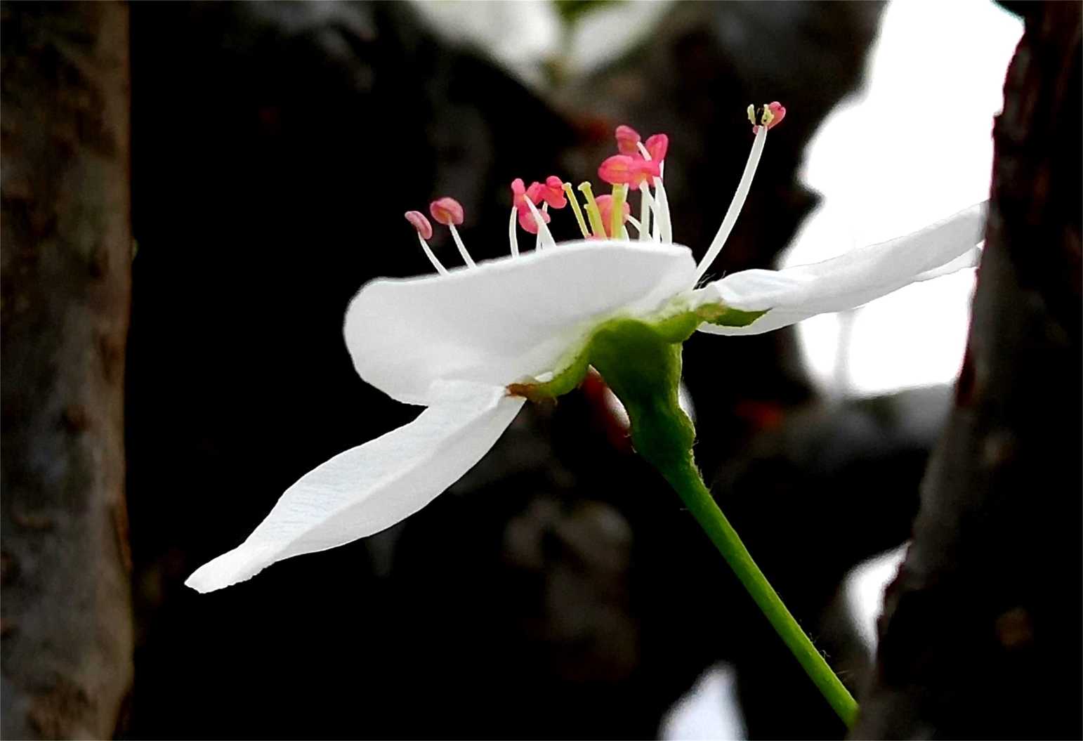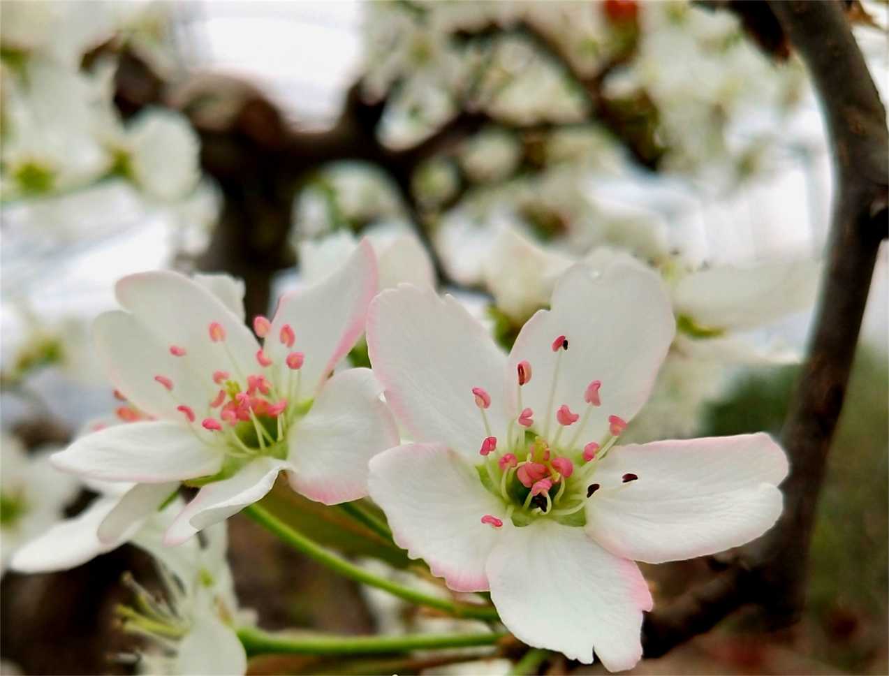 这棵梨花的花朵呈白色、粉色两种,看起来一种和雪花相似,另一种向浅色桃花,花瓣像一个个白色的小喇叭,花瓣环抱着细绒花蕊,顶端戴着一个个特制的小帽子,犹如悠闲美丽的”睡美人”。(高军 摄影)