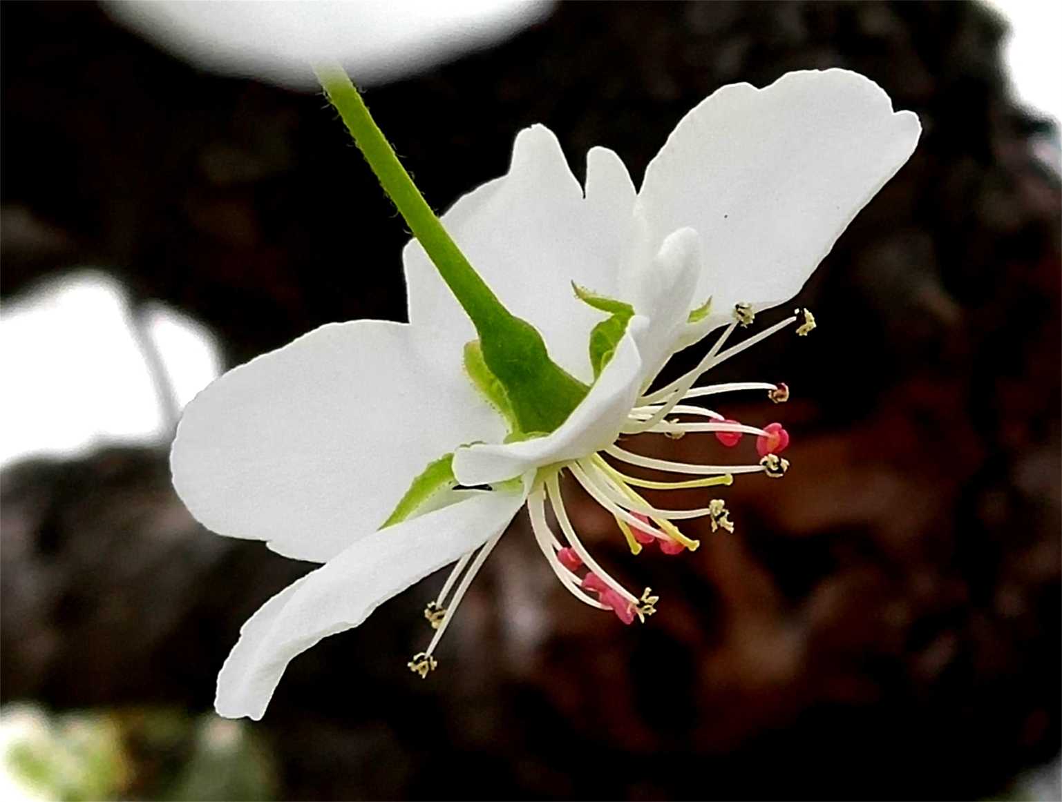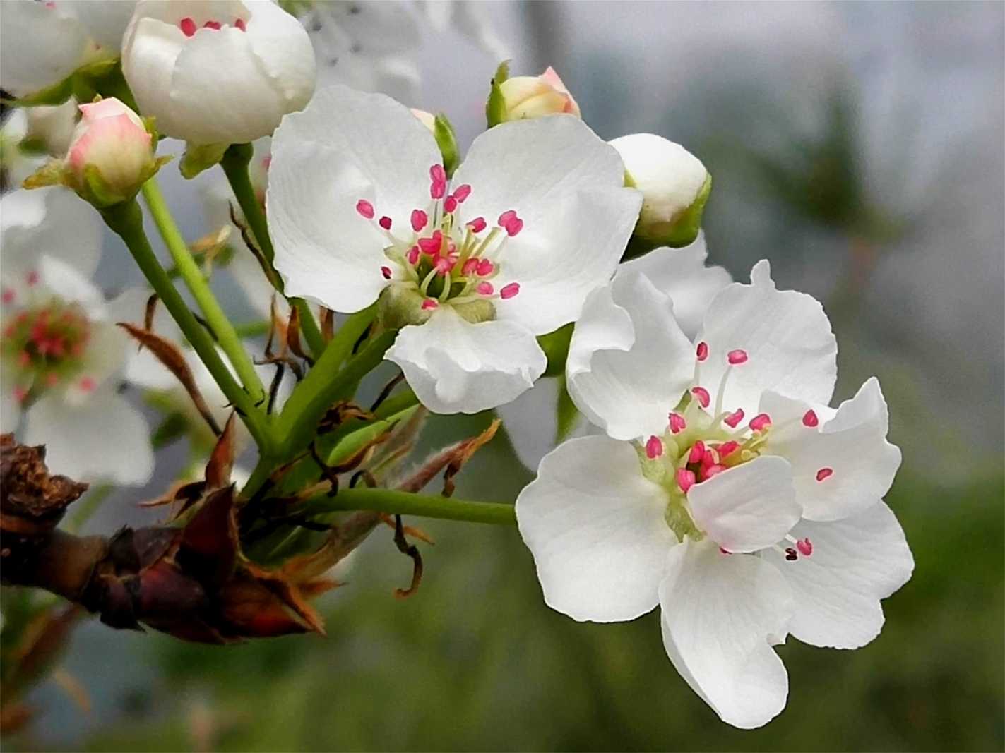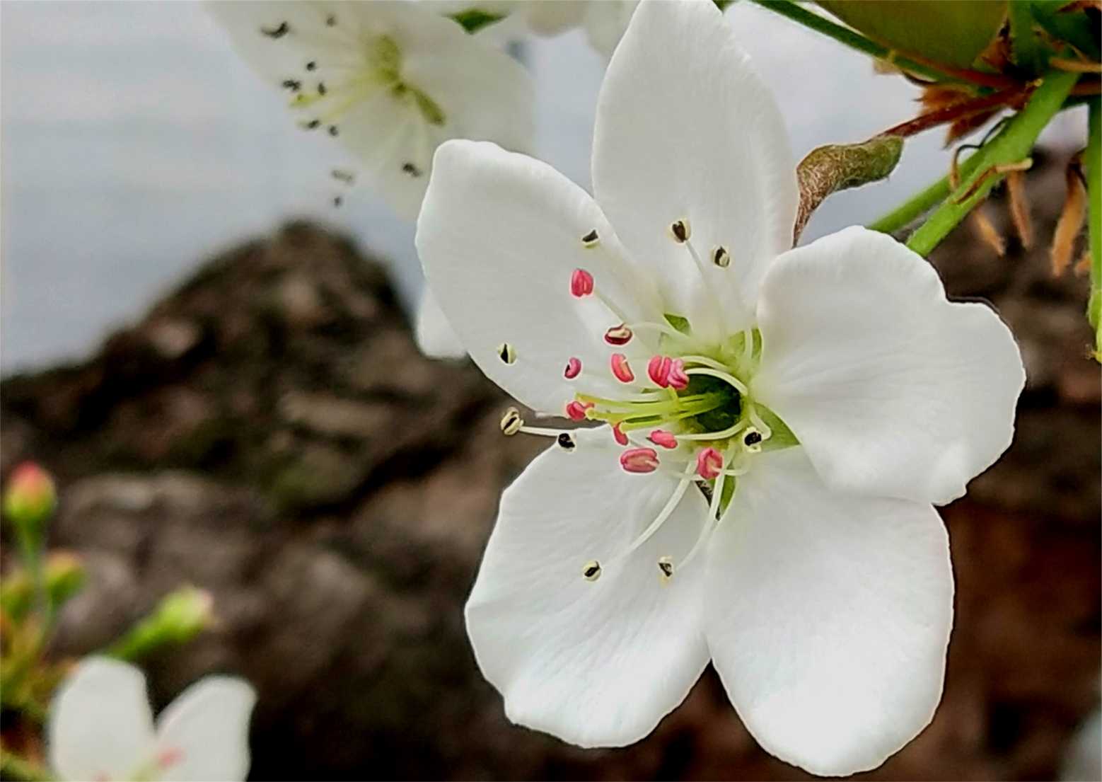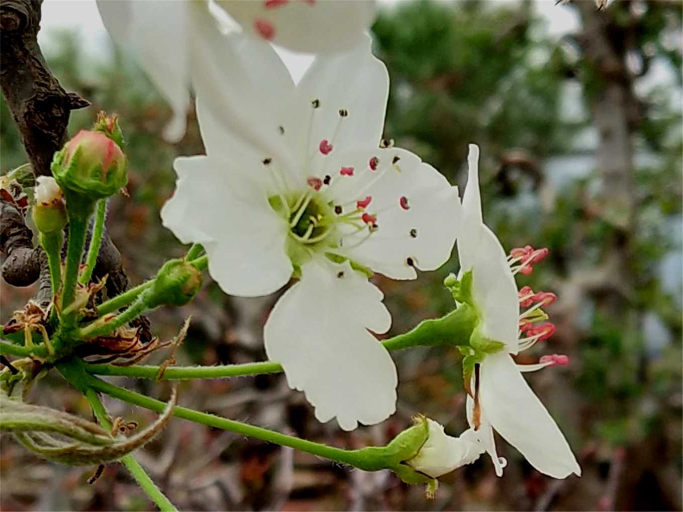 这棵梨花的花朵呈白色、粉色两种,看起来一种和雪花相似,另一种向浅色桃花,花瓣像一个个白色的小喇叭,花瓣环抱着细绒花蕊,顶端戴着一个个特制的小帽子,犹如悠闲美丽的”睡美人”。(高军 摄影)