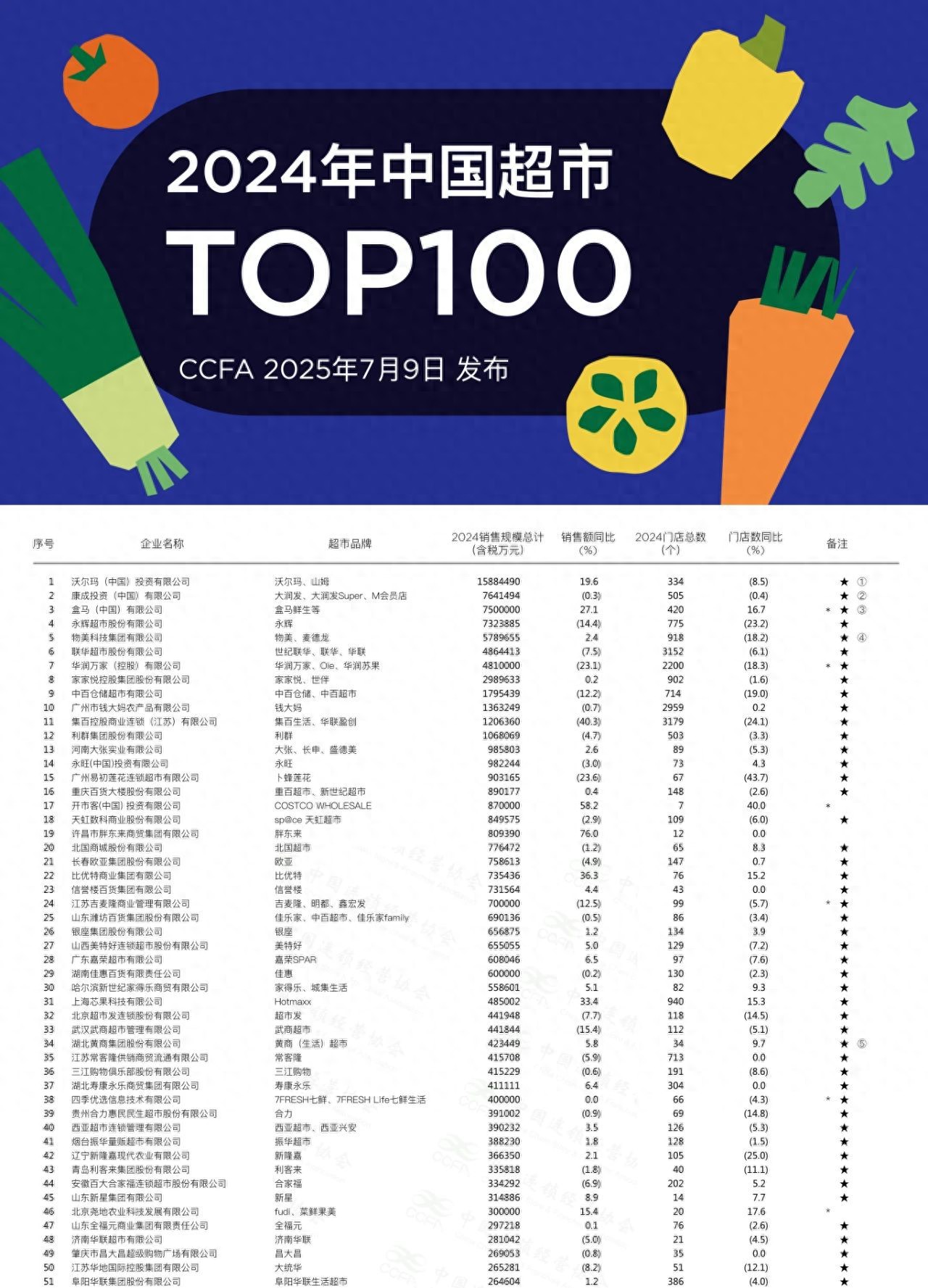 【大河财立方消息】7月9日,中国连锁经营协会发布2024年中国超市TOP100。