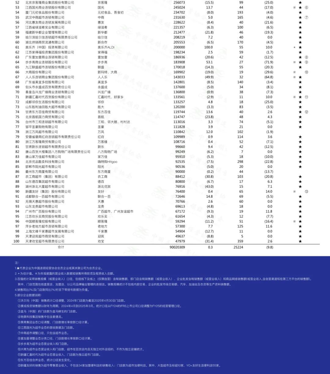 中国连锁经营协会提到,2024年超市Top100企业销售规模约为9000亿元,同比增长0.3%;门店总数2.52万个,同比下降9.8%。销售额同比增长的企业有42家,门店增加的企业有25家。销售额、门店数双增长的企业有14家。