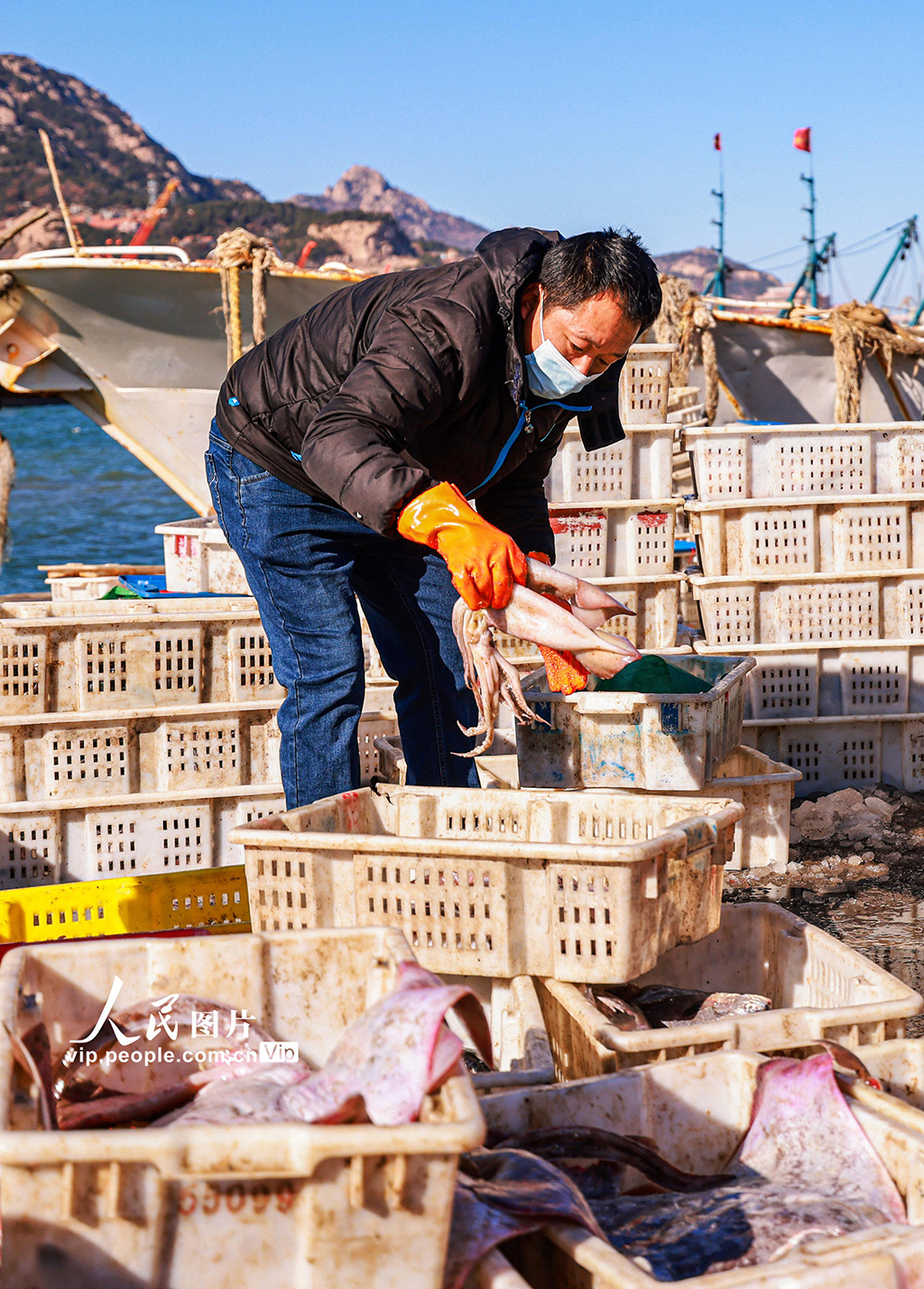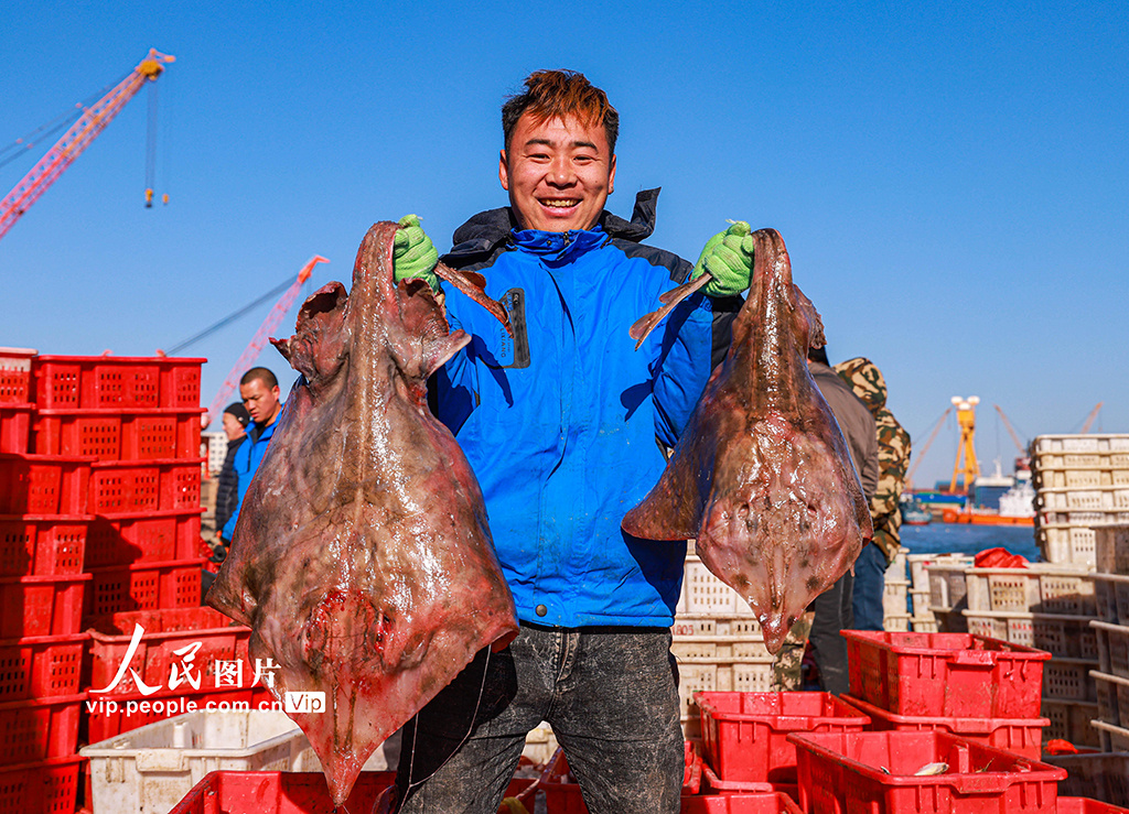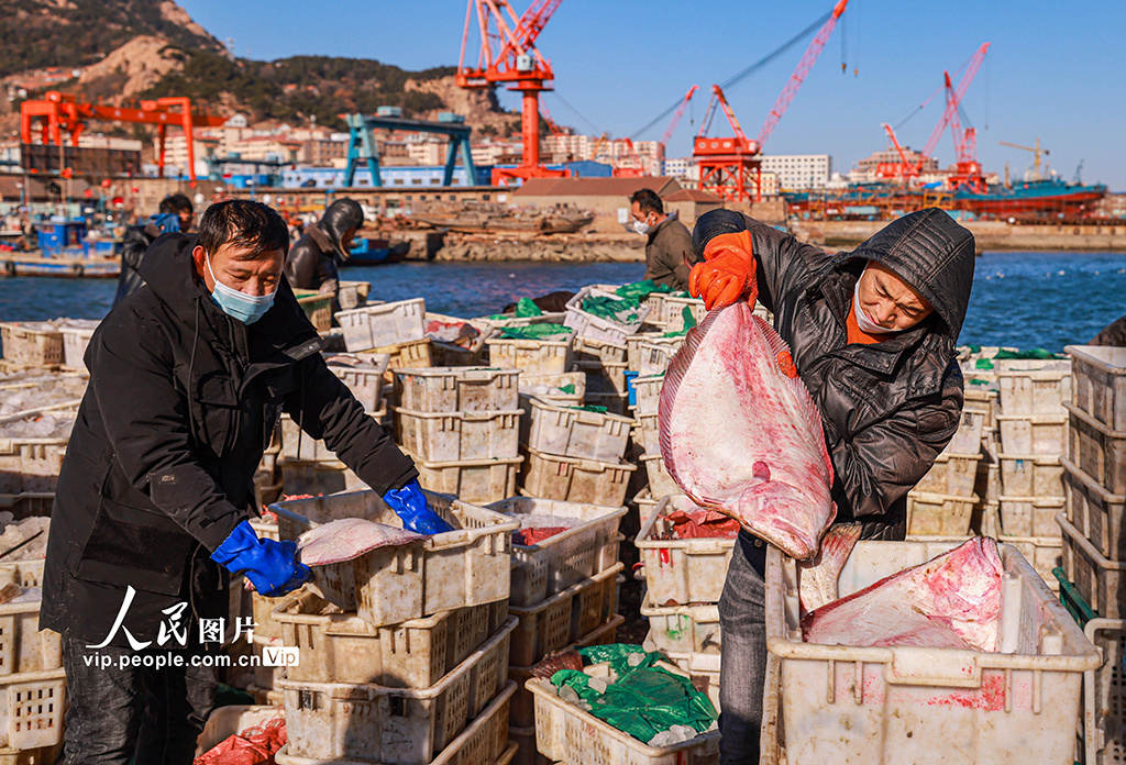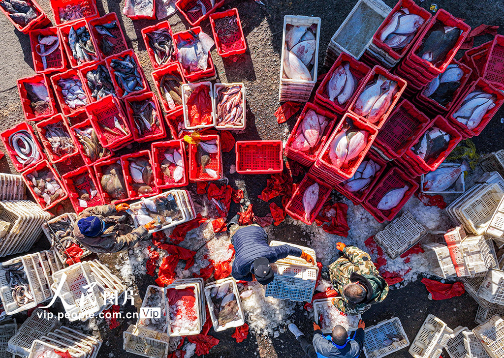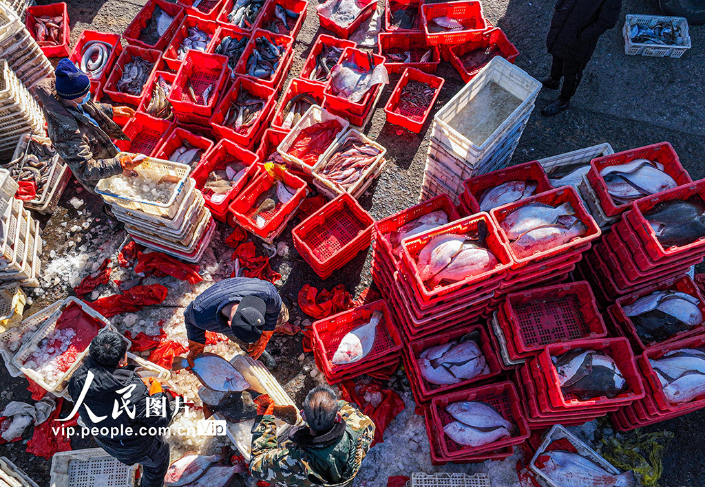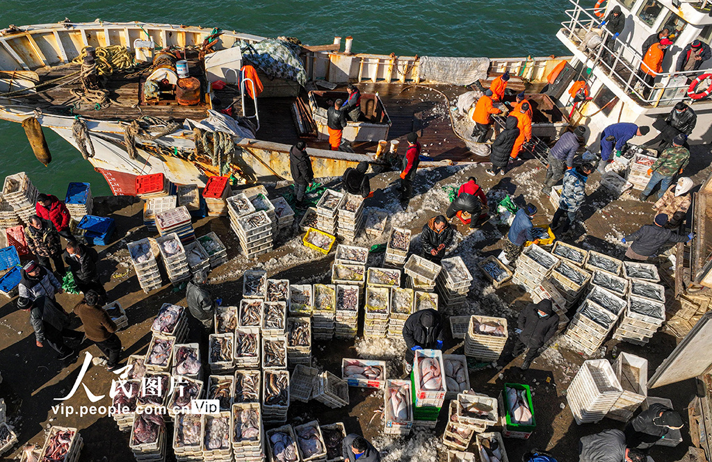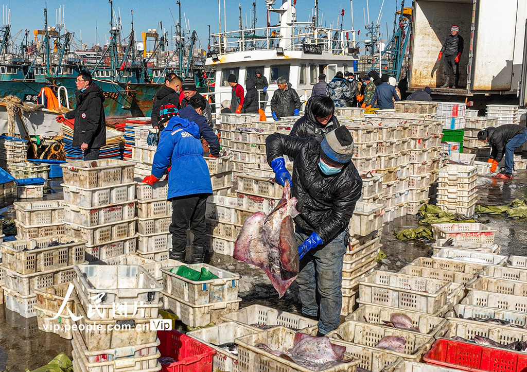 2023年1月9日,在山东省荣成市石岛渔港一处码头,渔民们忙着卸下各类渔获,吸引着鱼贩、市民前来采购。李信君摄(人民图片网)