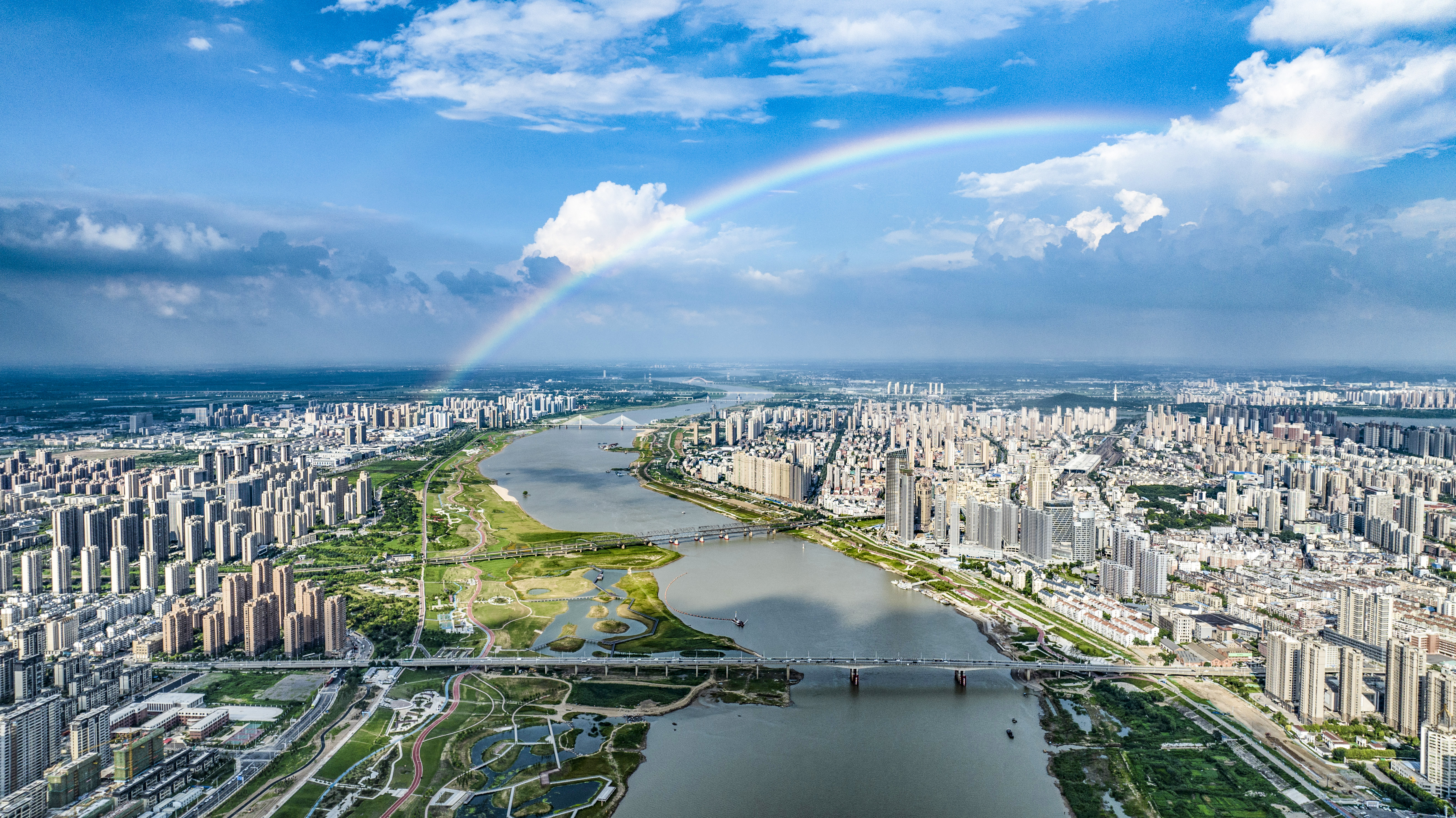 淮河干流安徽蚌埠主城区段,雨过天晴,一道彩虹横跨两岸。陈 昂摄