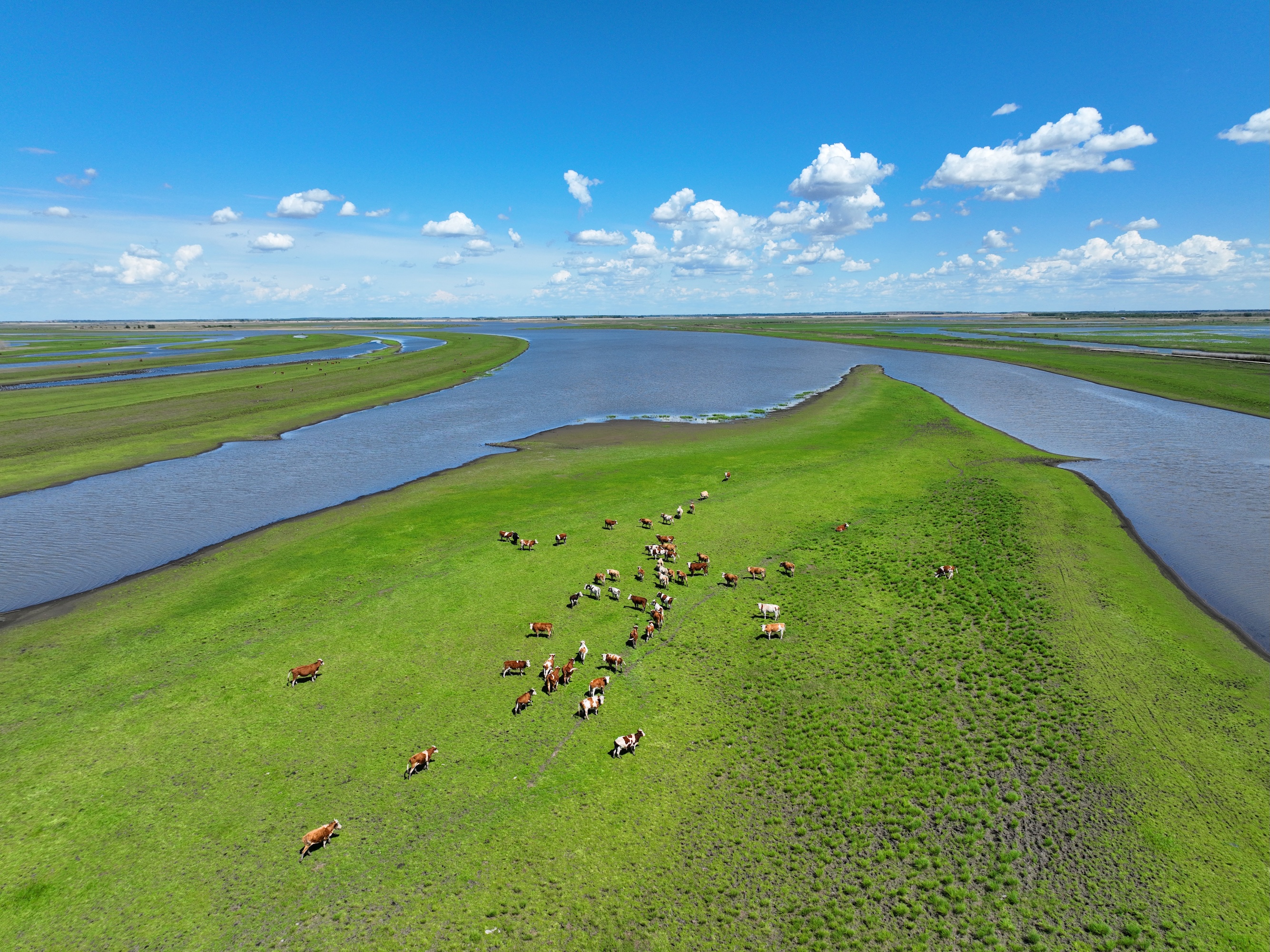 吉林白城镇赉县二龙涛河湿地,牛群在茵茵碧草间自在觅食。潘晟昱摄