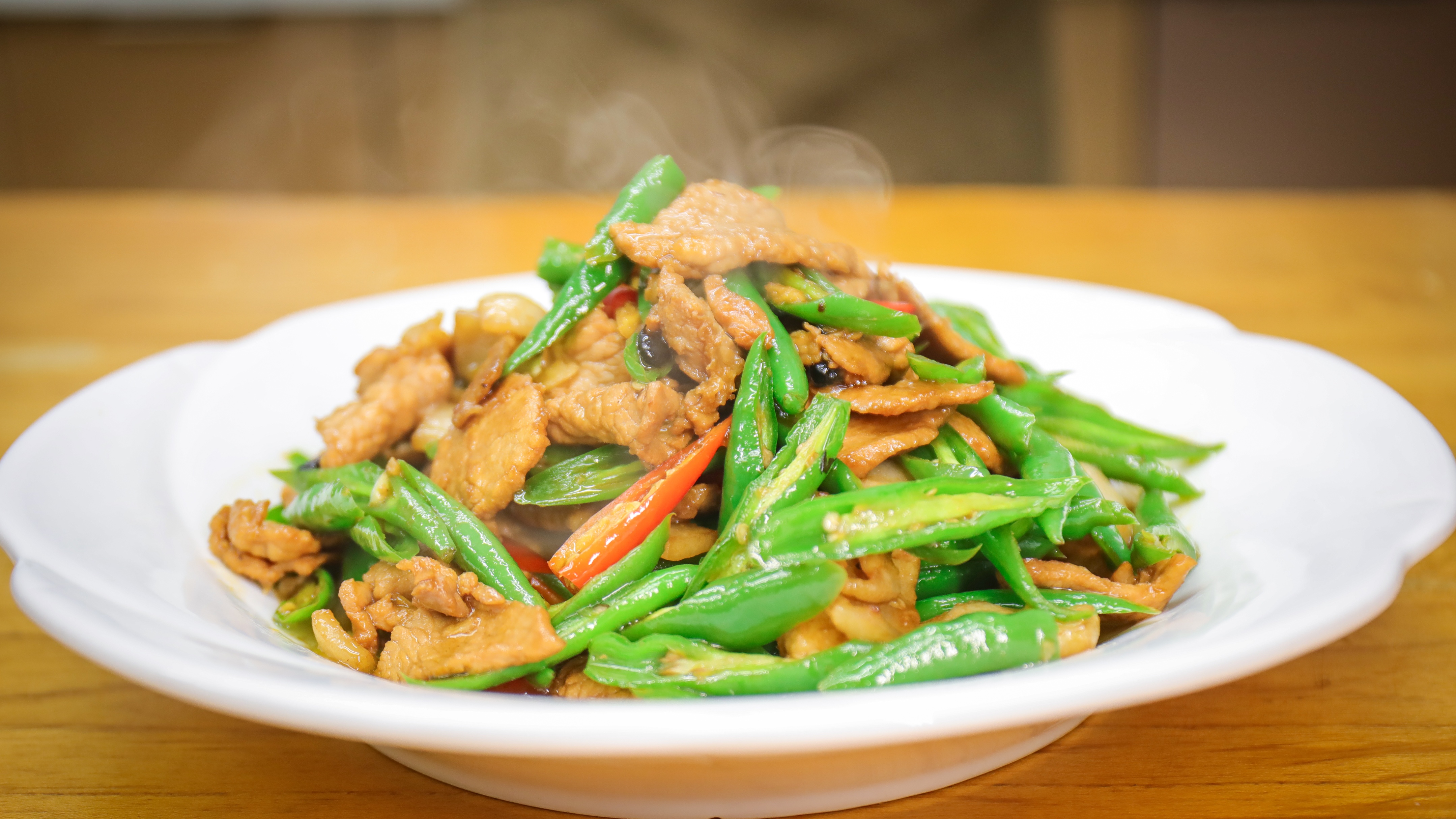 这个时候下入青红线椒,稍微加大火力,把香辣味炒出来,即可出锅。