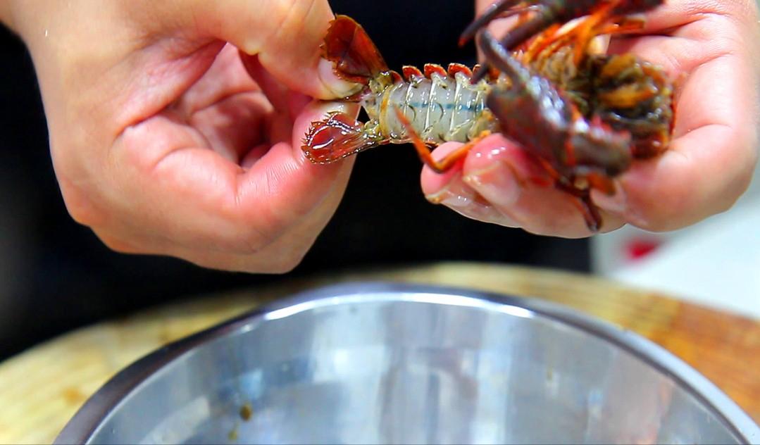 然后去一下虾线,用手捏住小龙虾尾部中间的小尾巴,拧半圈之后将虾线扯出。