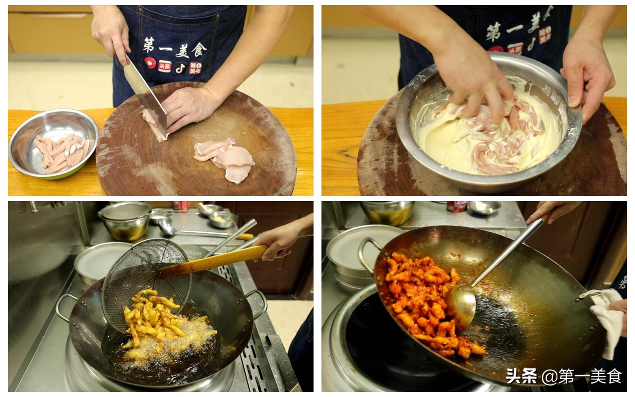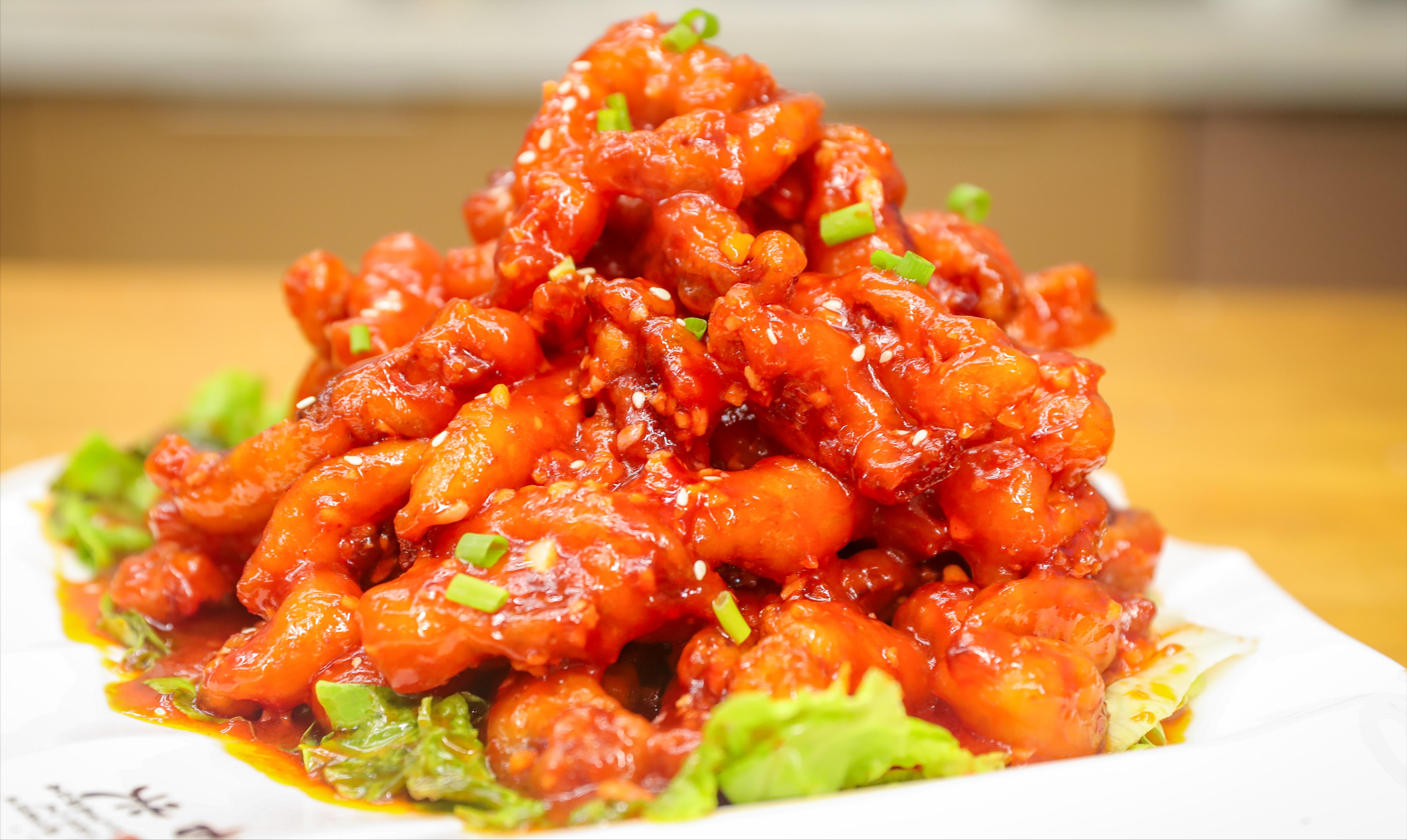 3.油温四成热下入肉条,鼓泡飘起慢慢炸定型,捞出来控油。油温五成热时复炸30秒,肉条呈砖红色捞出。再次升高油温至6成热复炸,使肉条达到外酥里嫩,不回软的效果。