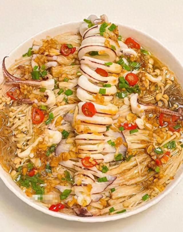 粉丝冷水泡十分钟,盘底铺一层,鱿鱼切圈别切断,蒜末热油爆香,一勺蚝油半勺糖,蒸锅里5分钟出锅。