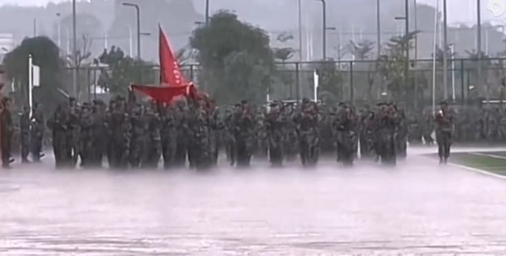 操场上,年轻身影纹丝不动。水珠顺着帽檐滑落,迷彩服浸透。这不再是简单的淋雨。一群人,在风雨中挺立,构成了青春最生动的注脚。