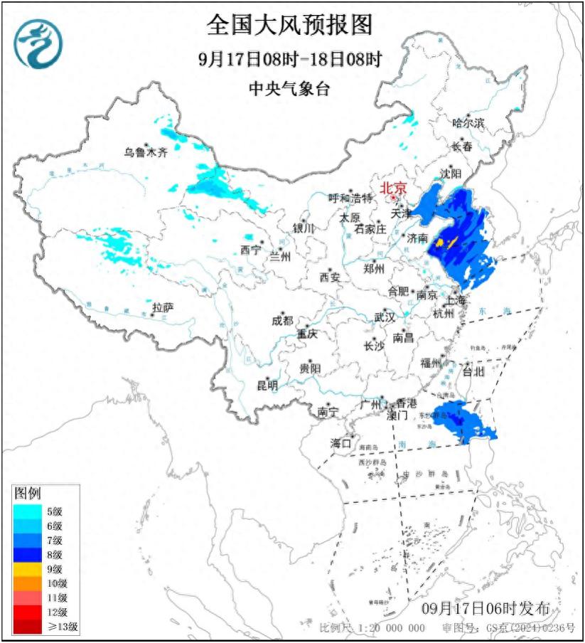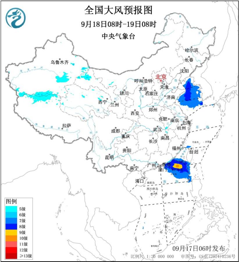 中央气象台9月17日6时发布大风蓝色预警和暴雨黄色预警。