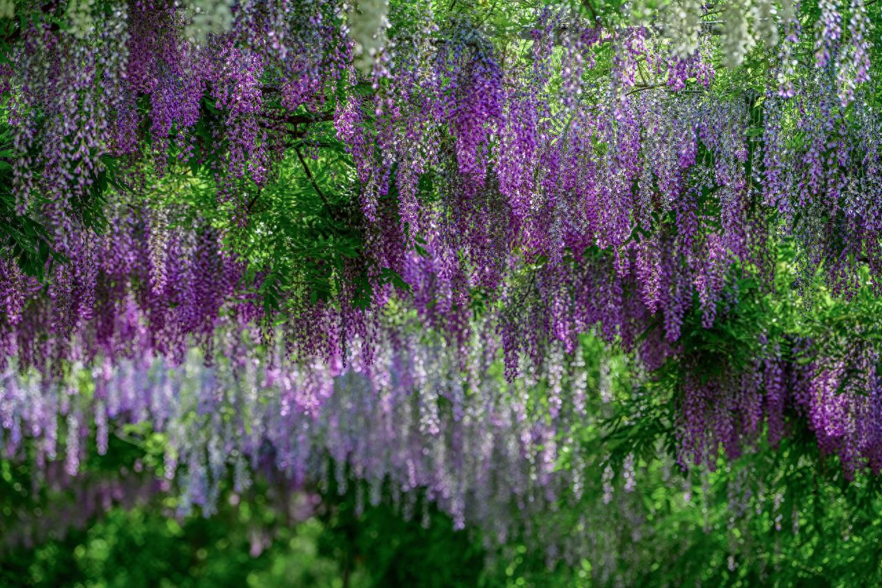 从未见过开得这样盛的藤萝,只见一片辉煌的淡紫色,像一条瀑布,从空中垂下,不见其发端,也不见其终极。只是深深浅浅的紫,仿佛在流动,在欢笑,在不停地生长。紫色的大条幅上,泛着点点银光,就像迸溅的水花。仔细看时,才知道那是每一朵紫花中的最浅淡的部分,在和阳光互相挑逗。