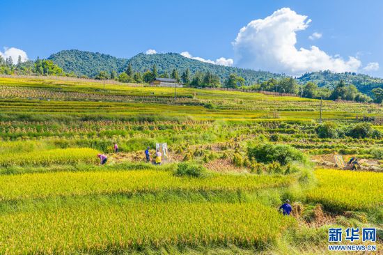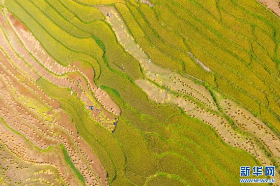 金秋时节,云南省昭通市绥江县中城镇回望村,数百亩高山梯田水稻逐渐成熟,当地群众抢抓晴好天气收割水稻,现场一派喜人“丰”景。