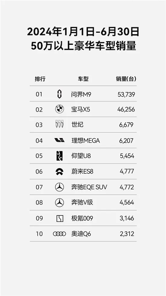 其中表现最好的豪华车型,当数问界M9。今年上半年,问界M9共卖出了53739辆新车,销量稳居中国市场50万元以上豪华车型第一,打败了德系三强(奔驰、宝马、奥迪)。