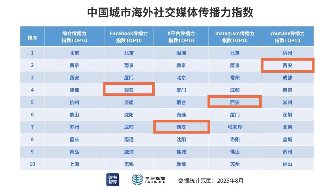 在本次指数发布结果中,西安位列综合传播力指数第三,仅次于北京和南京,表现亮眼。四至十位分别为成都、杭州、佛山、苏州、重庆、青岛、上海。同时,在中国城市脸书、X平台、照片墙、优兔、TikTok传播力指数的排名中,西安均跻身前十。