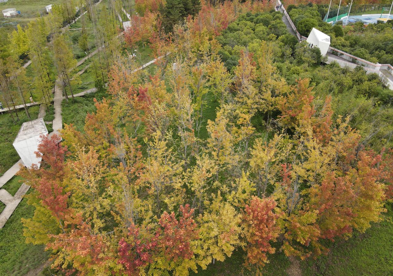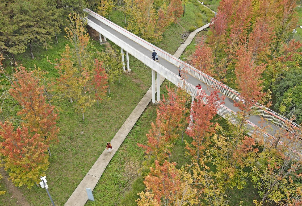 9月19日,西安雁南公园枫叶渐红,叶片红黄绿相间如调色盘。空中俯瞰,彩林与白廊桥相映;市民骑行漫步其间,在红叶与高楼的独特景致中尽享秋日浪漫。