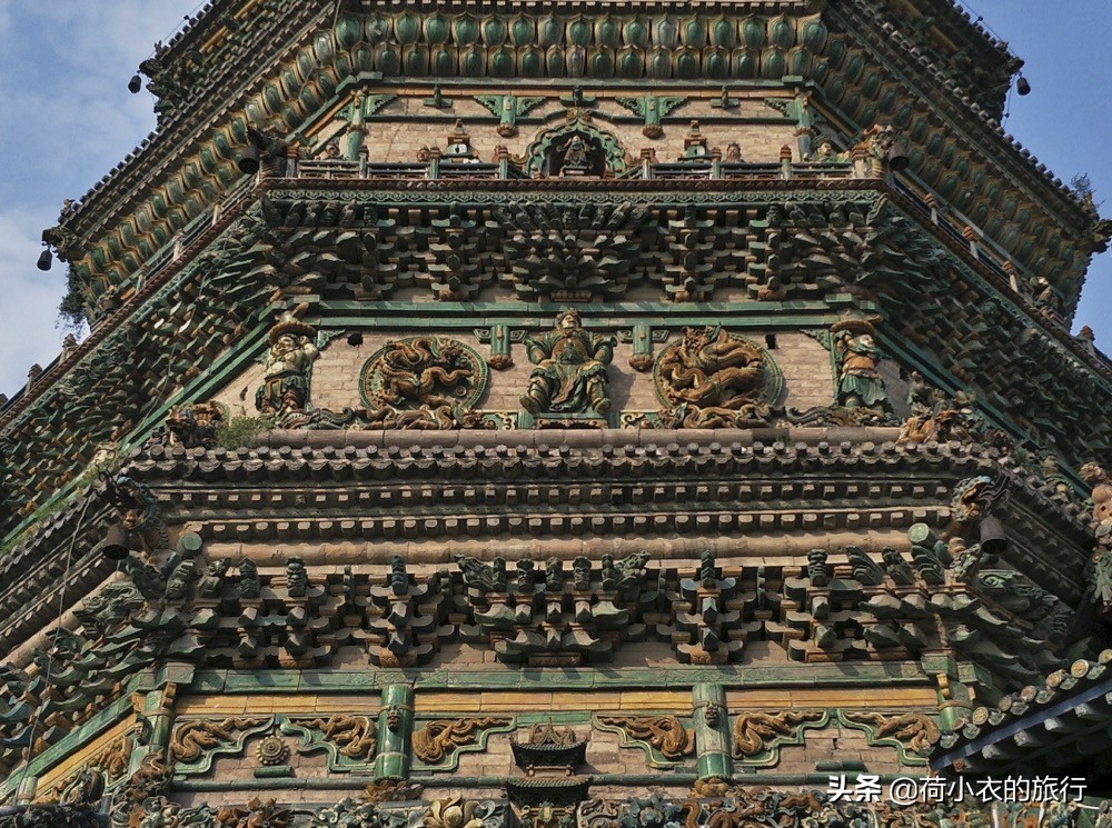 飞虹塔是中国现存最大最完整的一座琉璃塔,2018年经吉尼斯世界记录机构认证为世界最高的多彩琉璃塔”。塔身挂满各种琉璃挂件,鸟兽、花卉、栩栩如生的人物,佛经故事等,琉璃贴面更是精美绝伦,琉璃塔在光影照射下呈现出类似七彩虹的颜色,妙不可言。