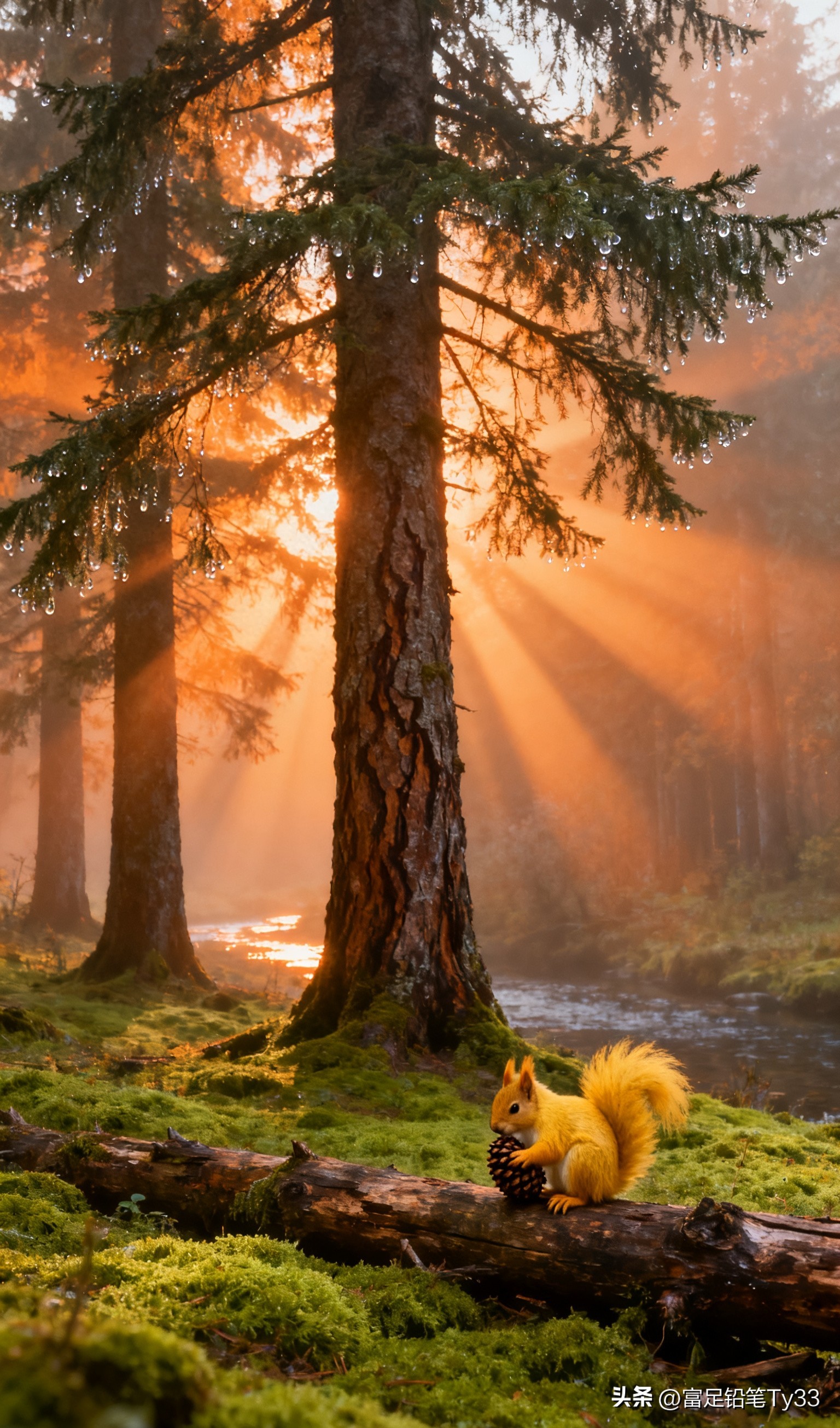 森林深处,夕阳正缓缓沉入地平线,将万丈金光洒向大地。在这片宁静的绿海中,几只小松鼠成为了最动人的风景。