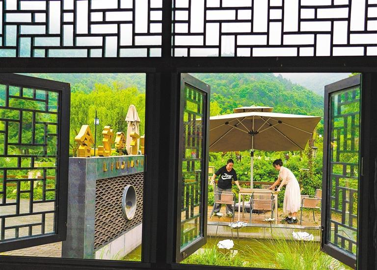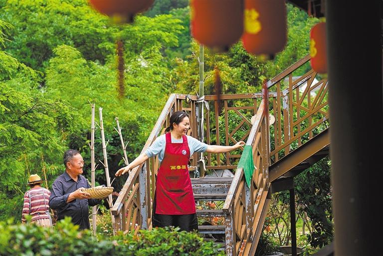 5月23日,定海区新建村村民袁其忠(中)在自家开办的农家乐小院里忙碌。该村盘活闲置农房、宅基地,打造住宿、餐饮一体化服务,带动村民在家门口创业就业。