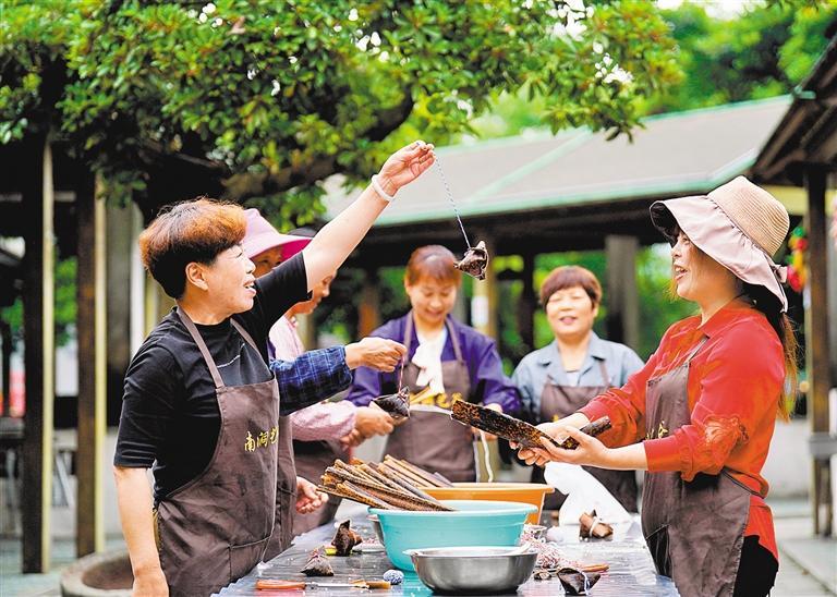 5月23日,定海区新建村村民在包粽子迎端午。该村定期开展“我们的节日”“我们的村晚”等活动,突出“农耕”“渔趣”“民俗”等主题,让村民在家门口乐享幸福生活。