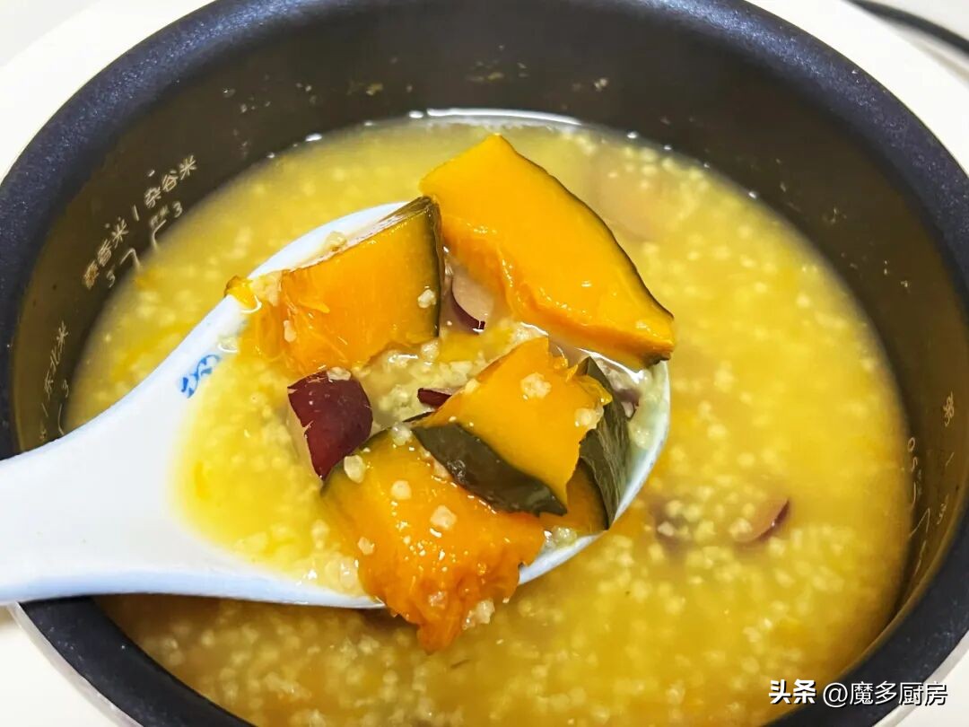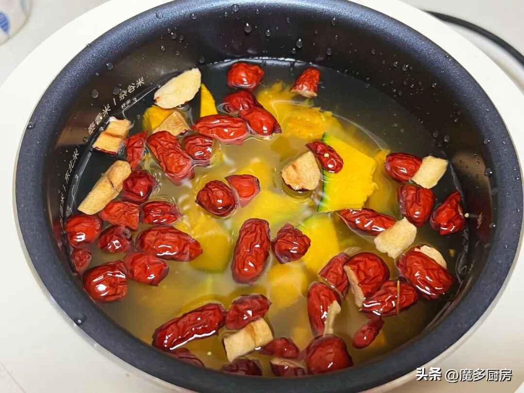 步骤1:睡前用电饭锅预约早餐粥。红枣去核切碎,南瓜洗净切小块,再加上适量小米,统统放进电饭锅里。