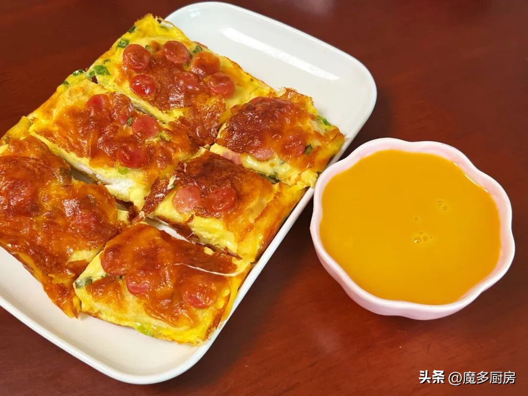 馒头披萨:馒头切片,将4个鸡蛋、切碎的香葱、切薄的烤肠片,和盐、白胡椒粉混合拌均匀,倒一半蛋液在烤盘里,放馒头片,再倒入另一半蛋液 ,铺均匀,撒马苏里拉奶酪芝士碎,放进预热好的烤箱,设置l180度,烤15分钟,上色均匀好看即可出炉。