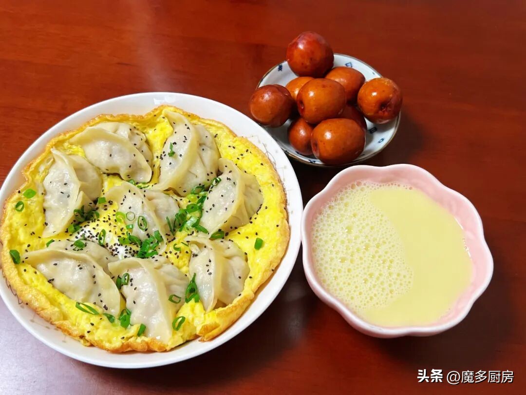 蛋抱煎饺:饺子是自己包的猪肉莲藕饺子,冷冻在冰箱里的。平底锅上火烧热,放食用油,油热后放饺子生胚,煎1-2分钟,再浇入清水到饺子的三分之一高度,盖上锅盖焖煮至熟,打开锅盖煎至水干,锅底还有余油,将鸡蛋打散,倒入锅里,再盖上锅盖,煎至蛋液熟透,打开锅盖收干底部的水分,撒上熟黑芝麻和葱花即可。