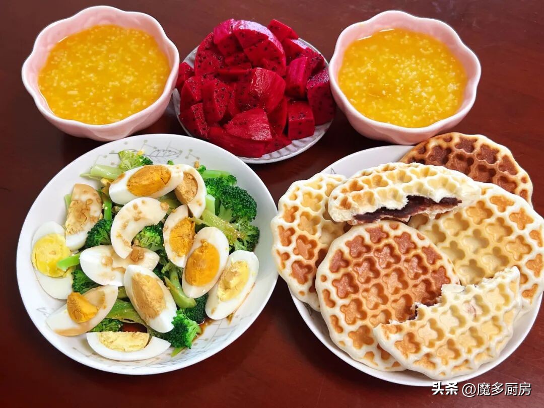 周六:南瓜粥、西兰花鸡蛋、豆沙华夫饼、火龙果。