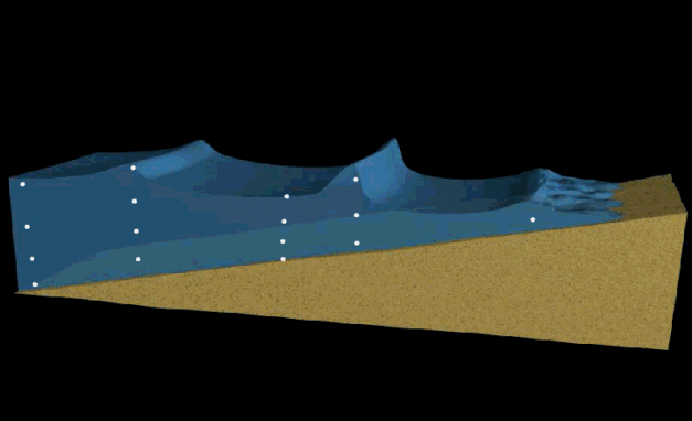 假设有一波海浪从深水区向海岸传播,那么它的传播过程就是这样的:当它是深水波的时候,其传播速度是基本不变的,而因为越接近海岸,海水就越浅,所以当海水的深度小于海浪波长的2分之1之后,海浪就会变成浅水波,在此之后,随着海水的持续变浅,海浪的速度也就越来越低。
