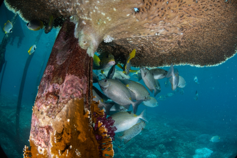 2020年12月21日在印度尼西亚四王群岛海域拍摄的一群藏在珊瑚下边的鱼。