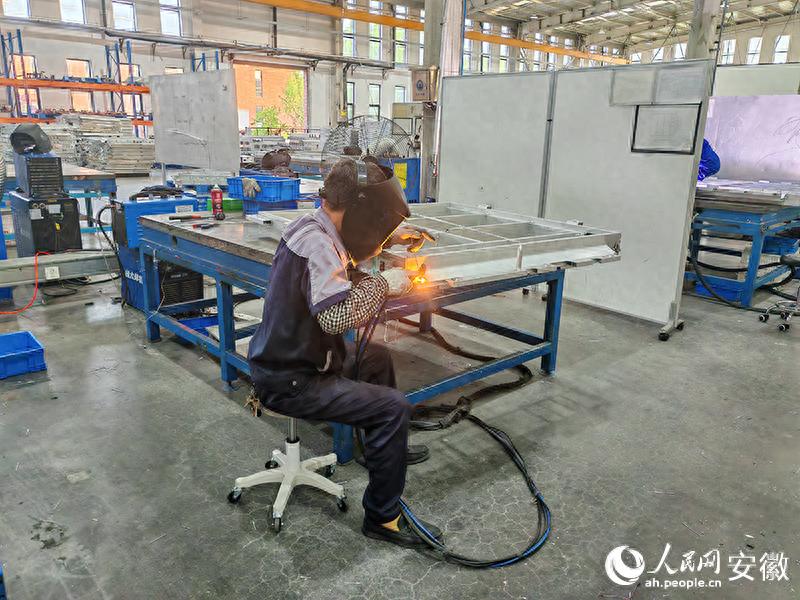国轩象铝工厂内的焊接工人。人民网 丁纪摄