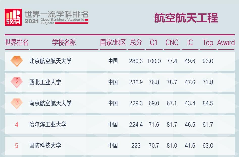在2021软科世界一流学科排名航空航天工程学科排名中,全球共有50所高校上榜,排名全球前5的高校均为中国高校,分别为北京航空航天大学、西北工业大学、南京航空航天大学、哈尔滨工业大学、国防科技大学。