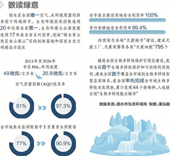 2013年至2024年,丽水市区PM2.5年均浓度由49微克/立方米下降至20.9微克/立方米,空气质量指数(AQI)优良率由81%提高至97.3%