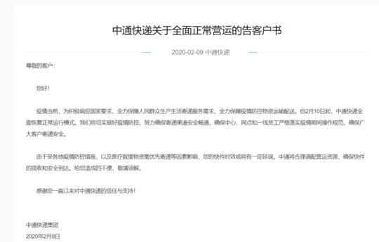 中通公告称:自2月10日起,中通快递全面恢复正常运行模式。我们将切实做好疫情防控,努力确保寄递渠道安全畅通,确保中心、网点和一线员工严格落实疫情期间操作规范,确保广大客户寄递安全。