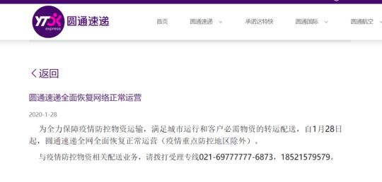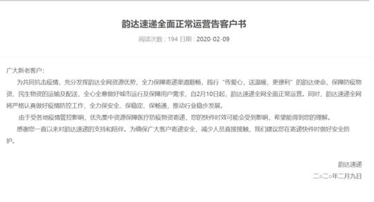 韵达方面表示,自2月10日起,韵达速递全网全面正常运营,但由于受各地疫情管控影响,优先集中资源保障医疗防疫物资寄递,快件时效可能会受到影响。