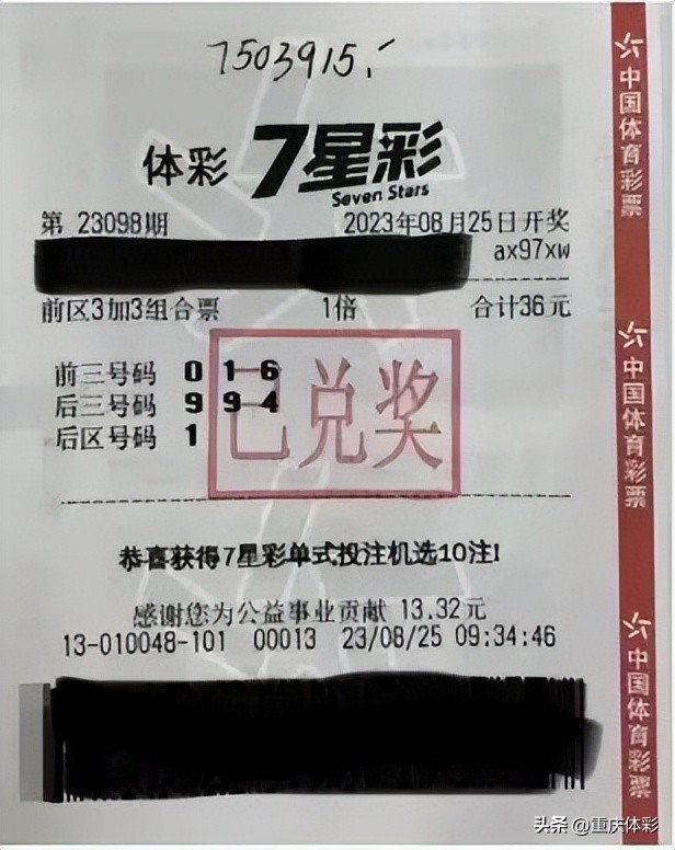 8月25日7星彩第23098期开出两注一等奖其中一注750万大奖被河北雄安新区购彩者以“3+3”组合的复式投注方式斩获