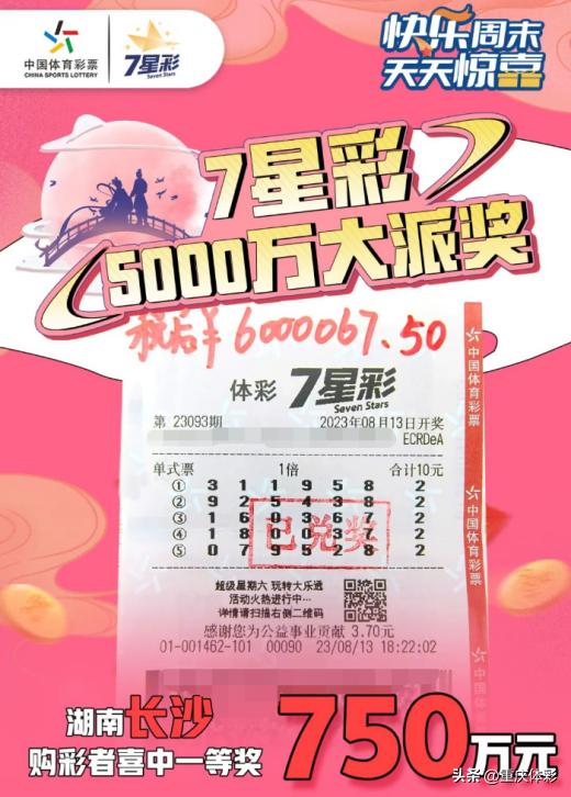 8月13日体彩7星彩第23093期开奖来自湖南长沙的购彩者刘先生(化姓)喜中单注一等奖750万元(含250万派奖奖金)