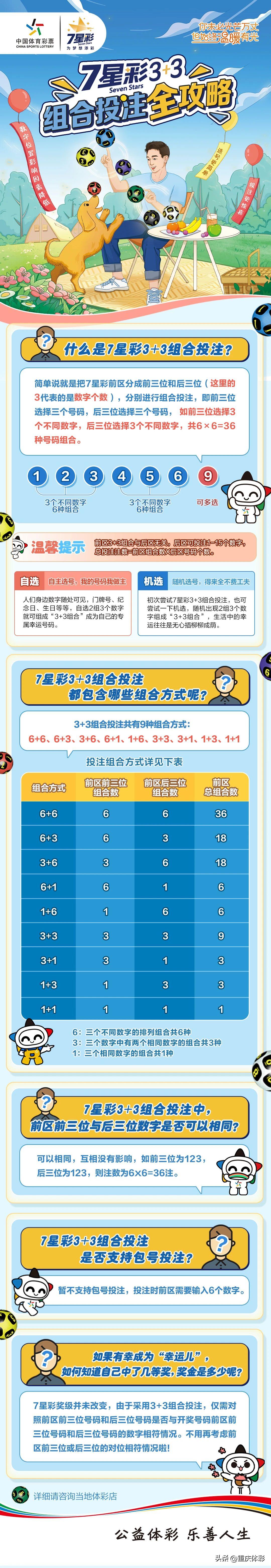“3+3”组合投注简单而言就是把7星彩前区分为前三位和后三位(这里的3代表的是数字个数)分别进行组合投注即前三位选择三个号码后三位选择三个号码号码可重复也可不同根据号码是否重复形成多种号码组合需要注意的是前区“3+3”组合与后区无关后区可自行投注1至15个数字
