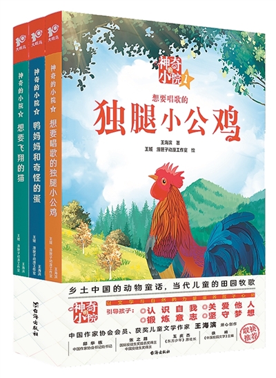 由《想要唱歌的独腿小公鸡》《鸭妈妈和奇怪的蛋》《想要飞翔的猫》三部作品构成的《神奇的小院》,贯穿的主调是执着、勇敢、专注、善良。《想要唱歌的独腿小鸡》讲的是一只天生只有一条腿的小公鸡如何顽强地学会走路、生存,如何学会啼叫,如何善待一切;《鸭妈妈和奇怪的蛋》讲的是为孵化一只鹅蛋而坚守的鸭妈妈的故事,她宁愿忍受饥饿、嘲笑、误解与亲人的遗弃,只为身下一只本不该她孵的鹅蛋;《想要飞翔的猫》讲的是一只小猫为飞翔的梦想而勇敢追求,为实现愿望冒险闯荡世界的故事。