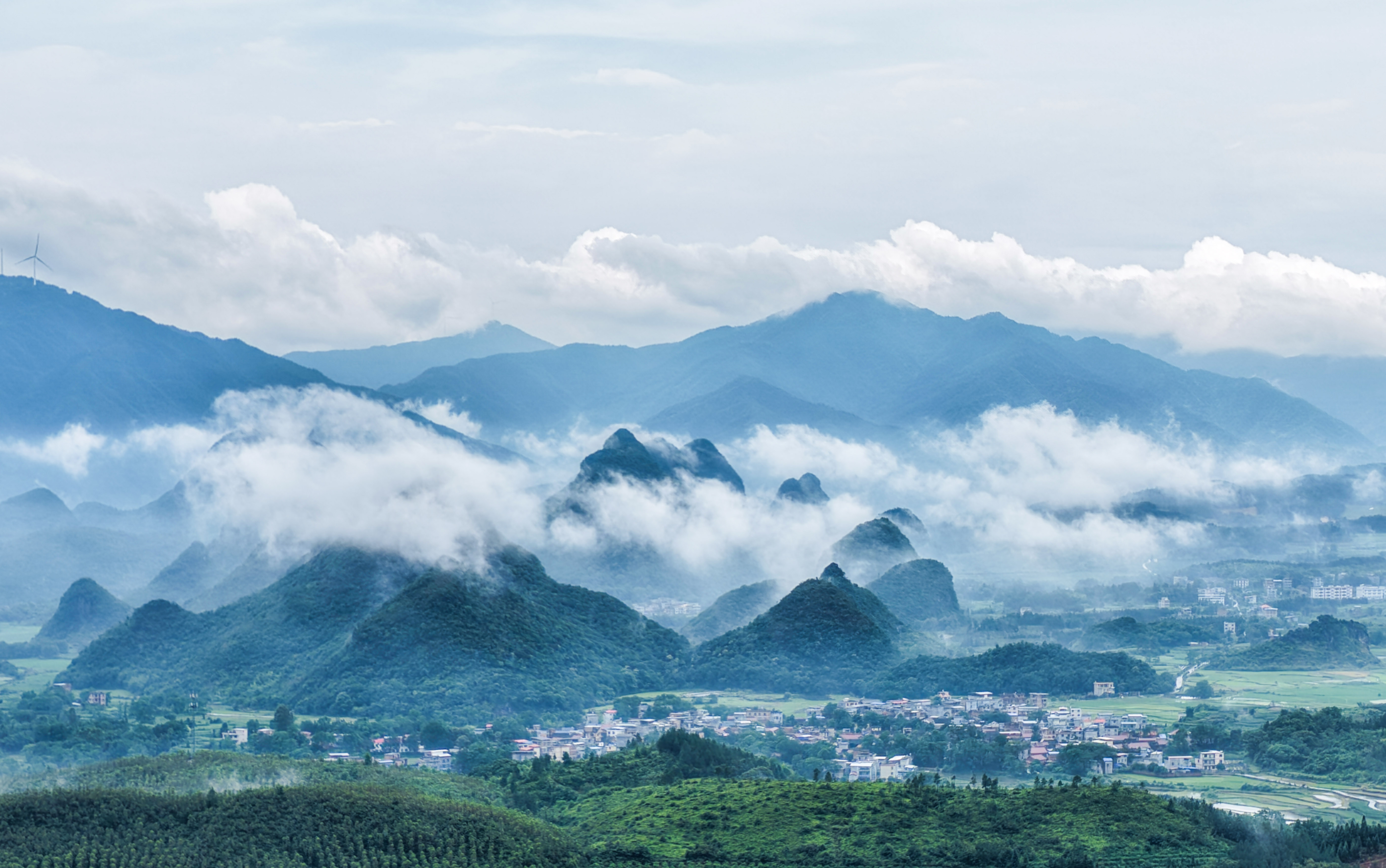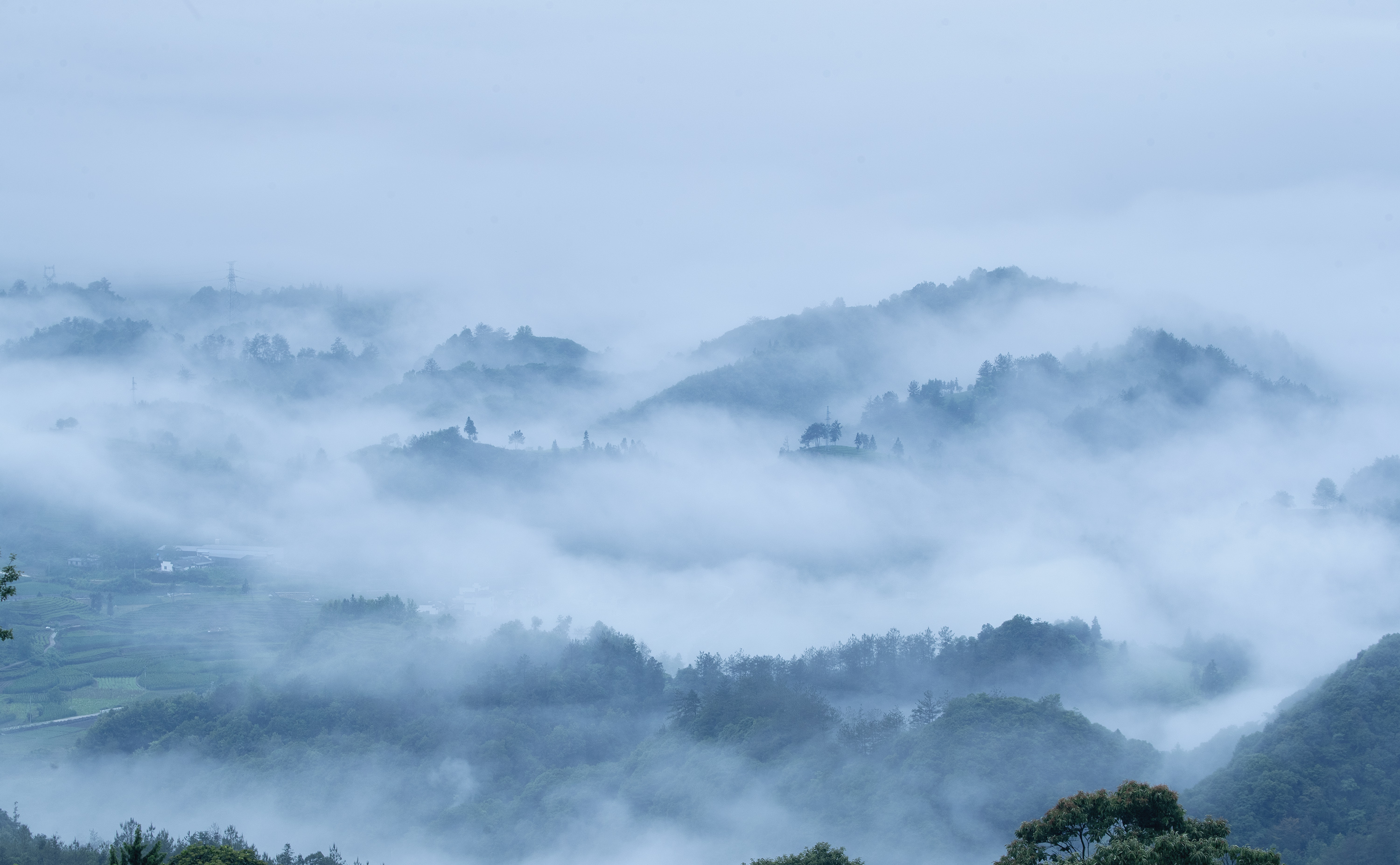 "一幅"被云雾笼罩的、如同水墨画般的中国山水景象。