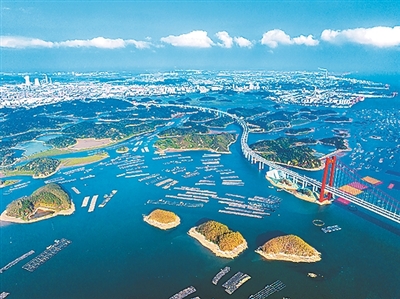 钦州市茅尾海海域,海天一色,蚝排如织,近海滩涂与跨海龙门大桥相互映衬,勾勒出一幅美丽画卷。