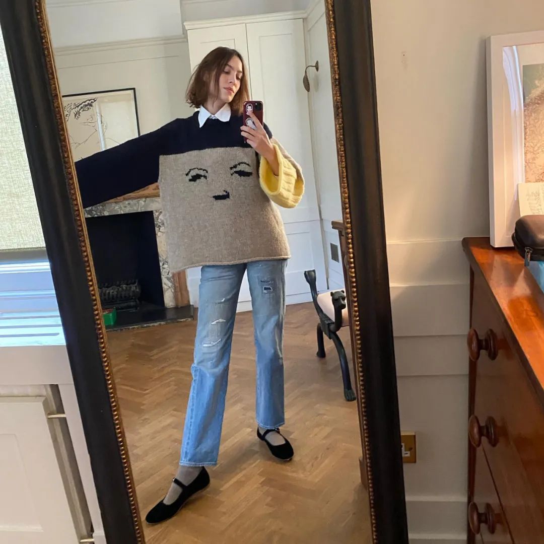 最近刷她的ins图,发现她现在穿最多的是这种款式的玛丽珍:平底、脚面只有一根绊带。搭配的都是直筒牛仔裤,还蛮适合日常参考的。▼