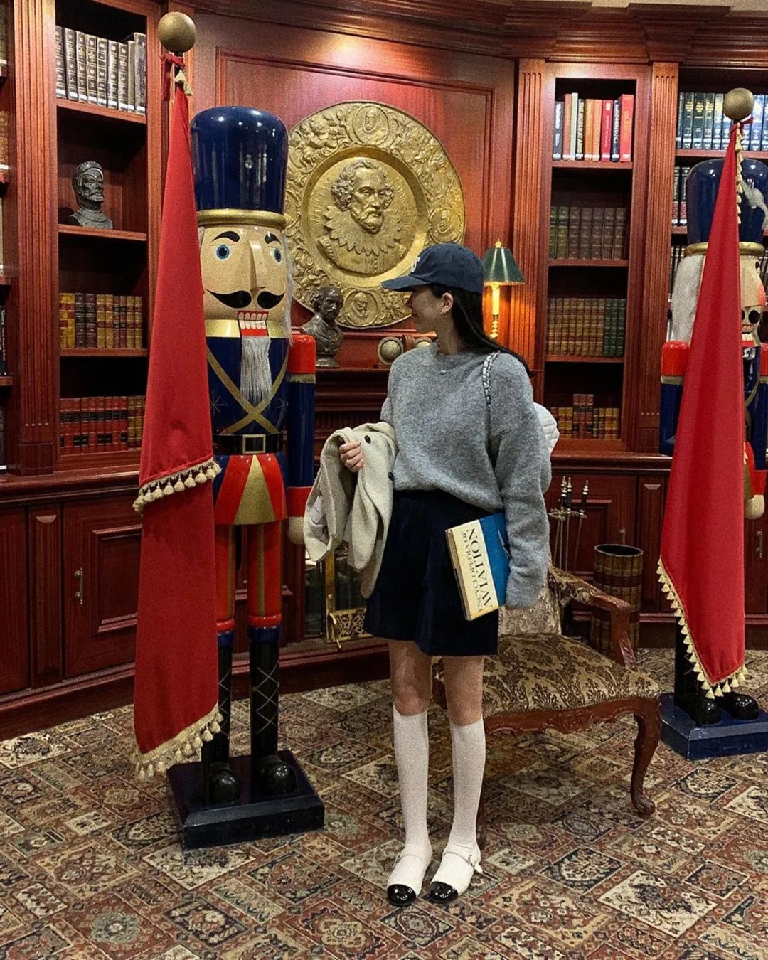 搭配上,除了像钟小姐一样配牛仔裤走休闲风,还可以打造复古少女风。方法也很简单:短裙+袜子+玛丽珍鞋。▼